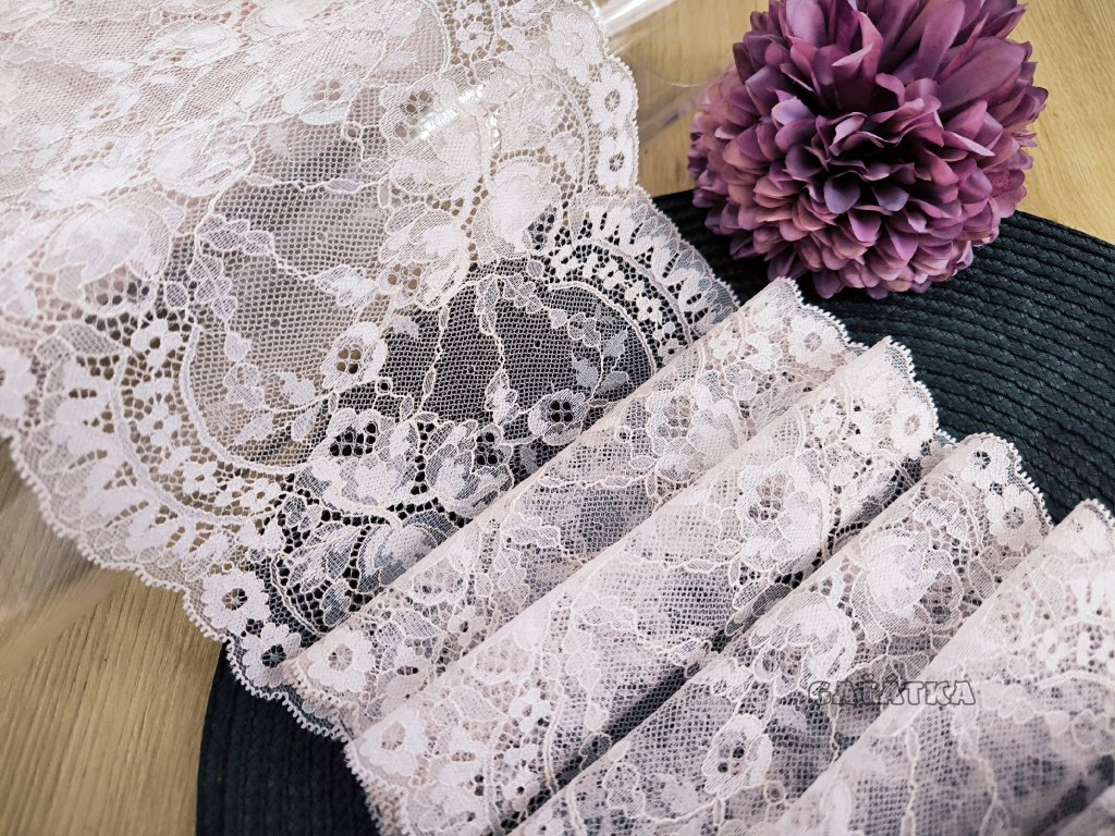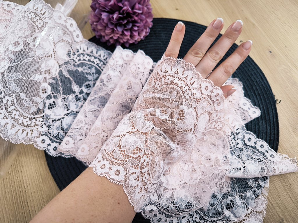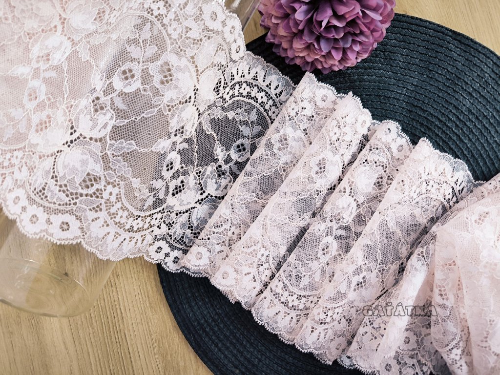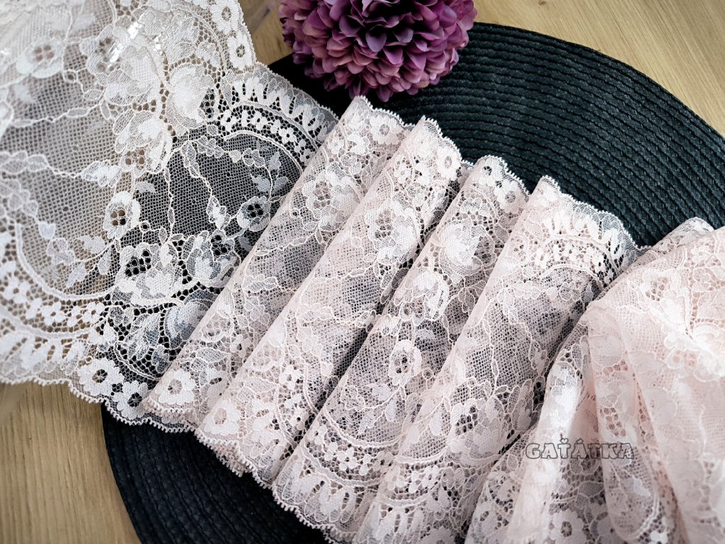 Elastická krajka jemná, pružná a příjemná na dotek. Ideální na šití spodního prádla, podprsenek, braletek, kalhotek či nočních košilek.