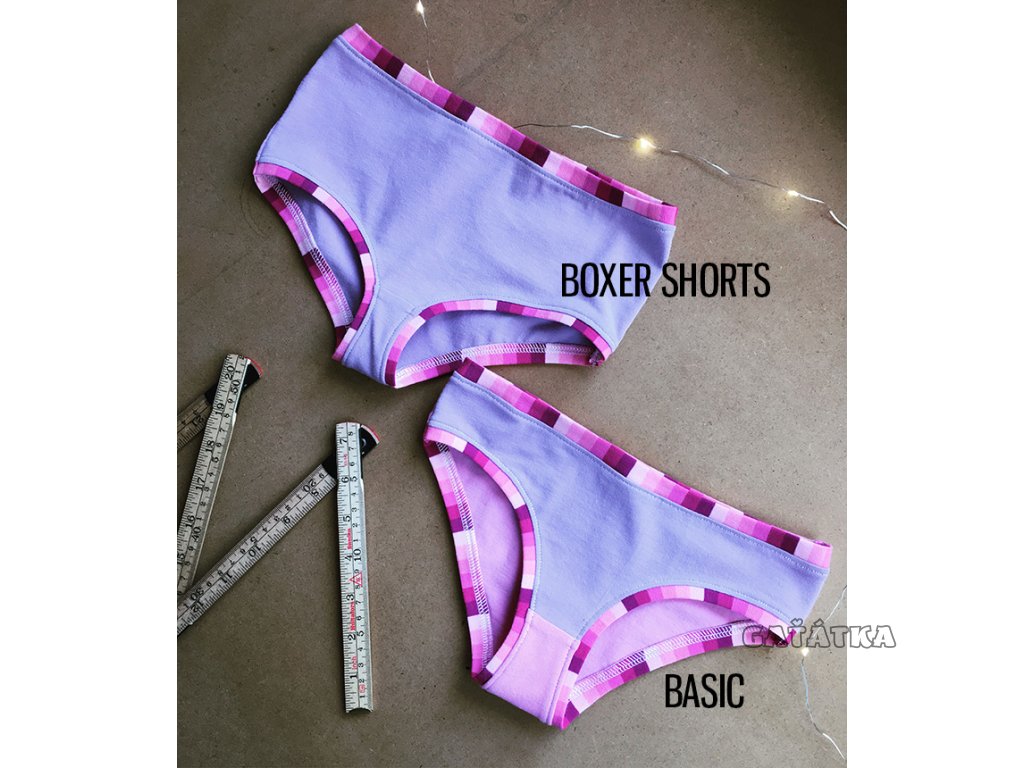 - BOXER SHORTS - boxerky - kalhotky s "nohavičkou", delším bočním švem a nižším pasem. Zadní díl půlený (možnost odšít v jednodílné verzi). Přední díl s možností vsadky do bočního švu.