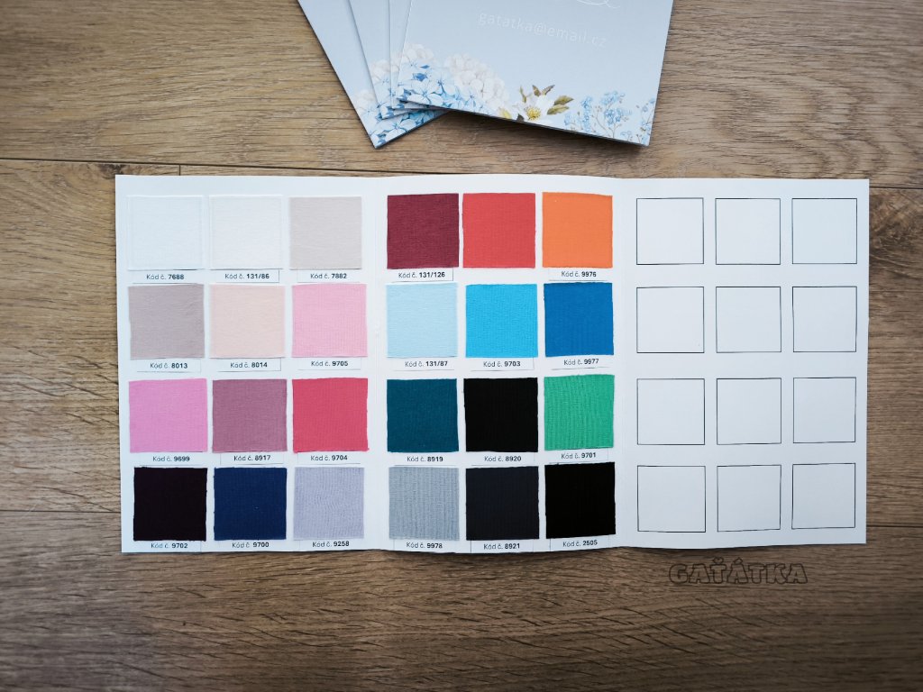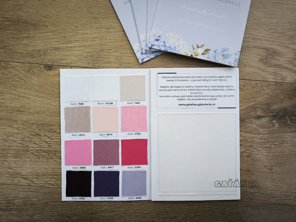 Úplet je příjemný na dotek, pružný a prodyšný, proto se perfektně hodí na šití spodního prádla, tílek, triček, legín, pyžam, šatů či dětského oblečení. Tento vzorník ti umožní přesně sladit barvy s krajkami, pruženkami či ozdobnými gumičkami, a tak si můžeš dopředu naplánovat kombinace, které budou ladit do posledního detailu.